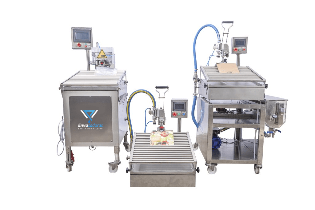 Las máquinas Envasadoras de Bag in Box, son máquinas envasadoras de formato de envasado Bag in Box; estos envases se componen de un bolsas interior llena de producto: líquidos, aguas, salsas, mermeladas, miel, vinos, vermut, vinos blancos, vinos tintos, vinos rosados, bebidas espirituales, licores, aceite de oliva, aceite de girasol, vinagres, lubricantes, agua mineral, zumos, purés de frutas, zumos de frutas, zumos, mosto, leche, geles, jabones, aceites corporales, productos químicos, geles hidro-alcohólicos..., con un dosificador del producto grifo, goma alimentaría, tapón a rosca, tapón a presión; esta bolsas de bag in box, esta soportada o cubierta de una caja la cual le da conservación y mantiene el producto estable para su consumo. Su proceso u operativa de trabajo es manual, semiautomática o automática: Se inserta la bolsa de bag in box en el cabezal, quitan el tapón o grifo, hacen un pequeño vacío a la bolsa de bag in box, empiezan el llenado pre-establecido y al finalizar, se coloca el grifo.
